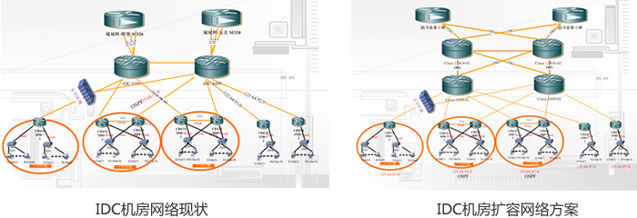 德阳机房现阶段以二台Cisco 6509核心网络交换设备, Cisco 6509至泰北M320和网管M320分别以8条1000M光纤接入互联网,单设备上实现链路互为备份。德阳电信根据业务发展需要已拟定完备网络扩容。